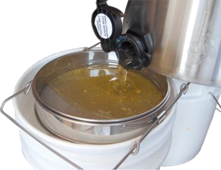 Once the honey has been extracted, it needs to be filtered. Filtering removes the wax caps, bee parts, and other stuff which you'd rather not have in your bottled honey.